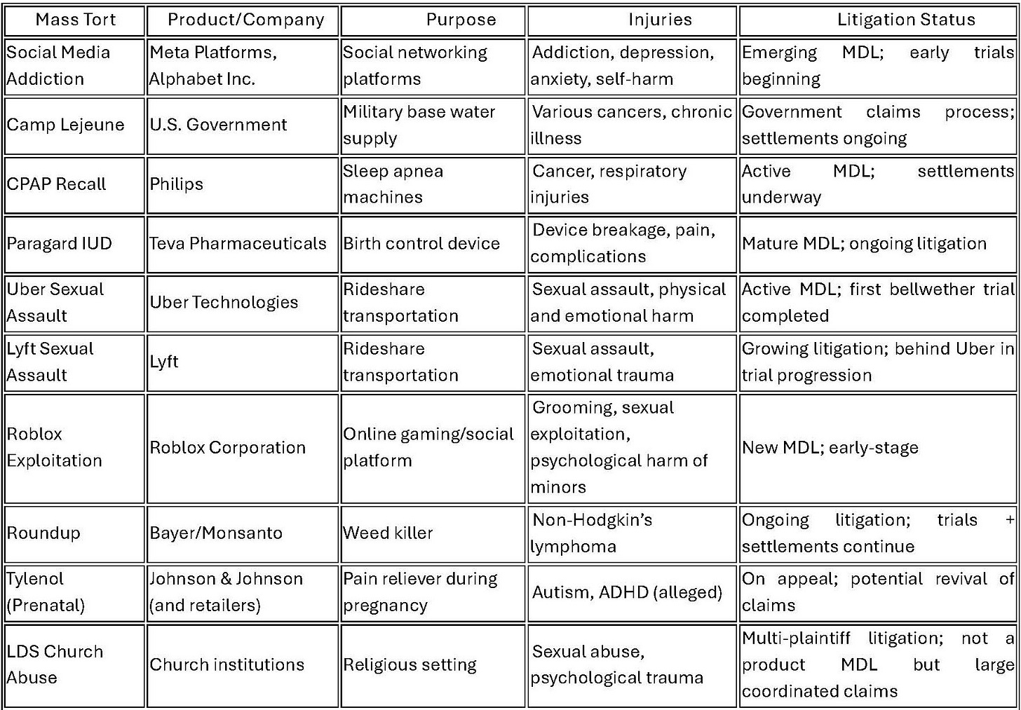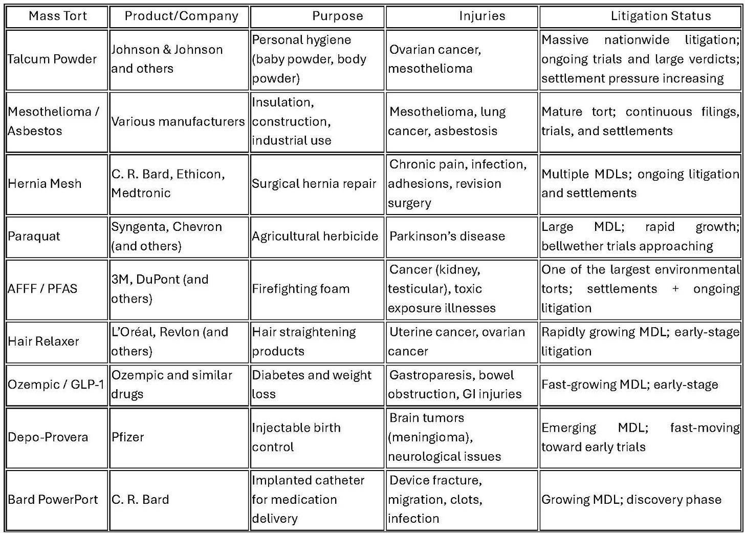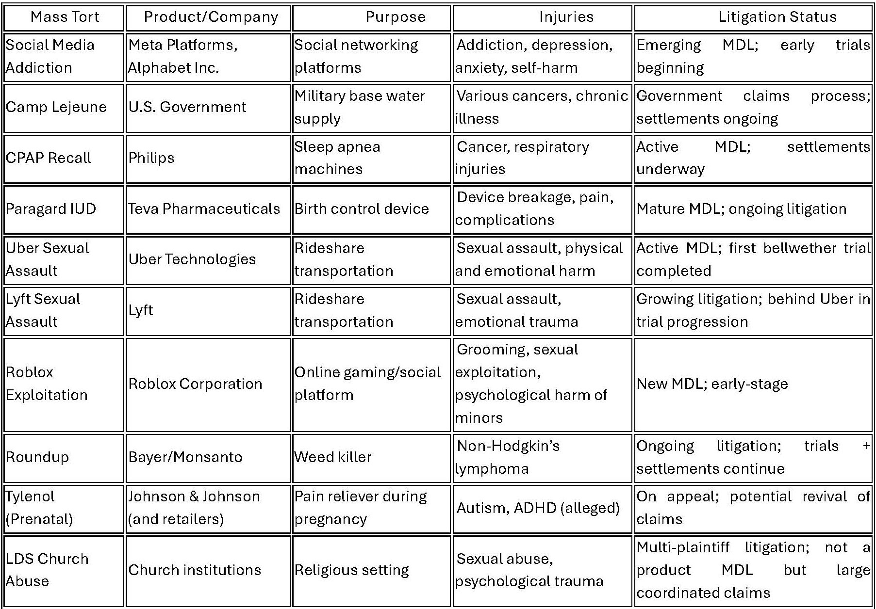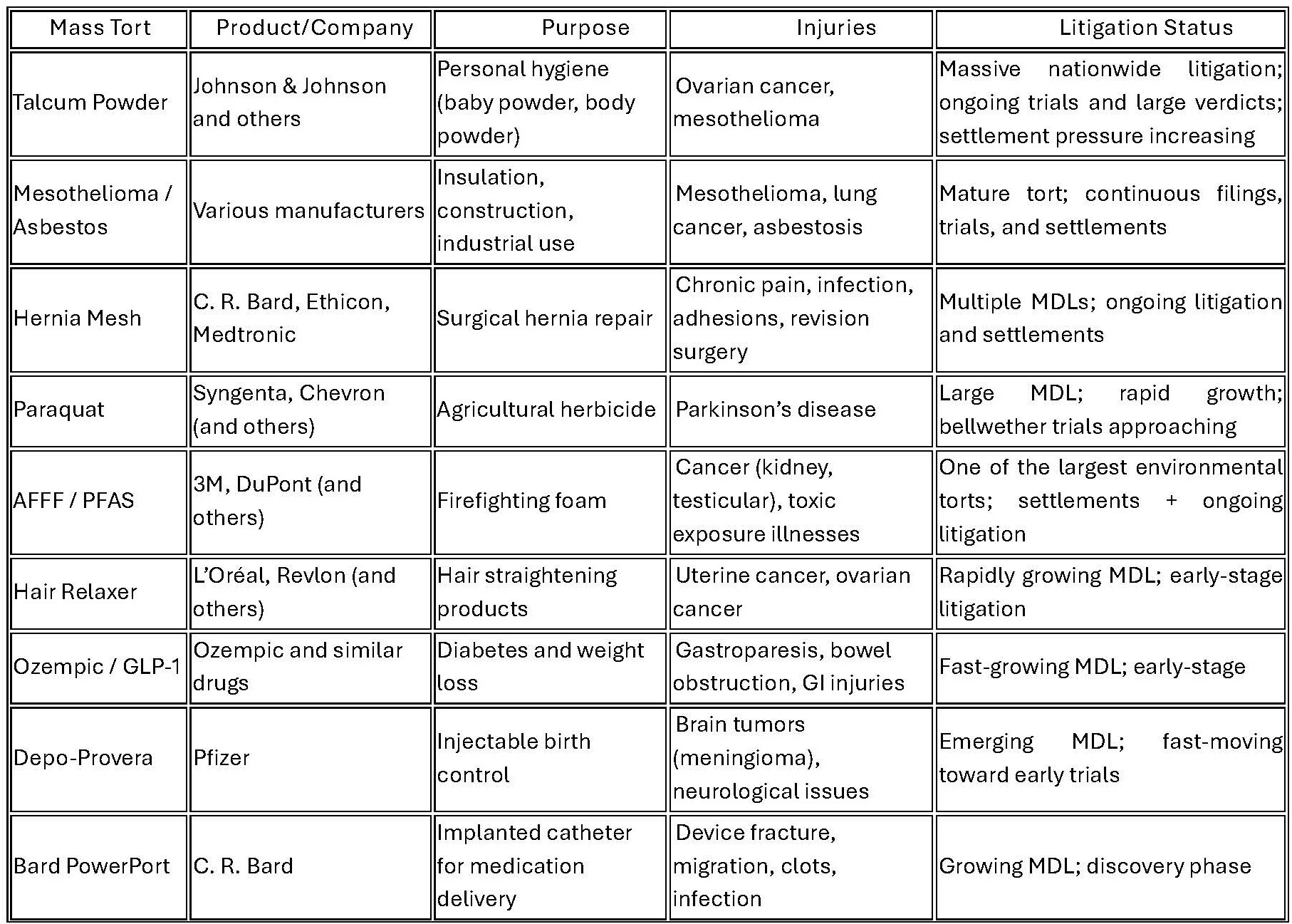 Across the country, individuals are bringing claims against major corporations for injuries linked to everyday products, medications, and services. Below is a detailed overview of the most significant mass torts in 2026—what the products are, how they are used, the injuries alleged, and where each litigation currently stands.